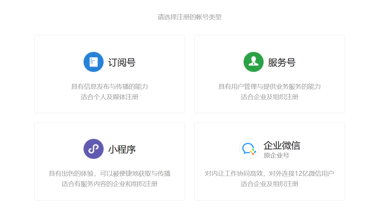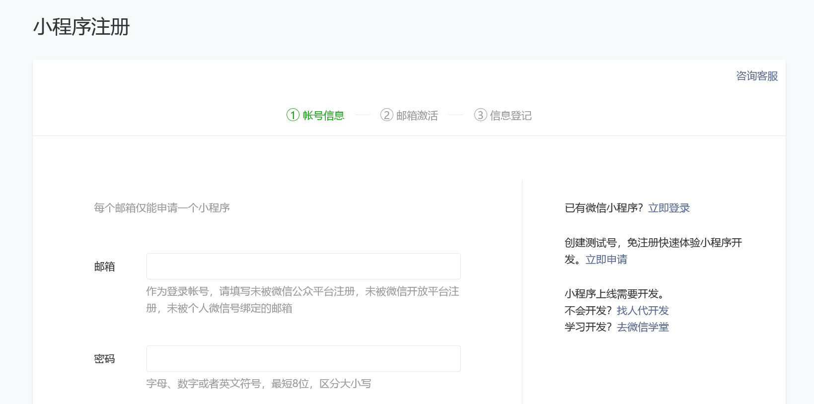 1) 微信公众平台官网首页(mp.weixin.qq.com)点击右上角的“立即注册”按钮。 2) 选择注册的帐号类型,选择“小程序”。 3) 进入帐号信息页面,填写未注册过公共平台、开放平台、企业号、未绑定个人号的邮箱,这个邮箱将作为以后登录小程序后台的帐号。 4) 填写个人帐号信息后,邮箱收到一封激活邮件,点击激活链接,进入主体信息页面填写相关内容,即可完成注册流程,主体信息一经提交后便不可修改。